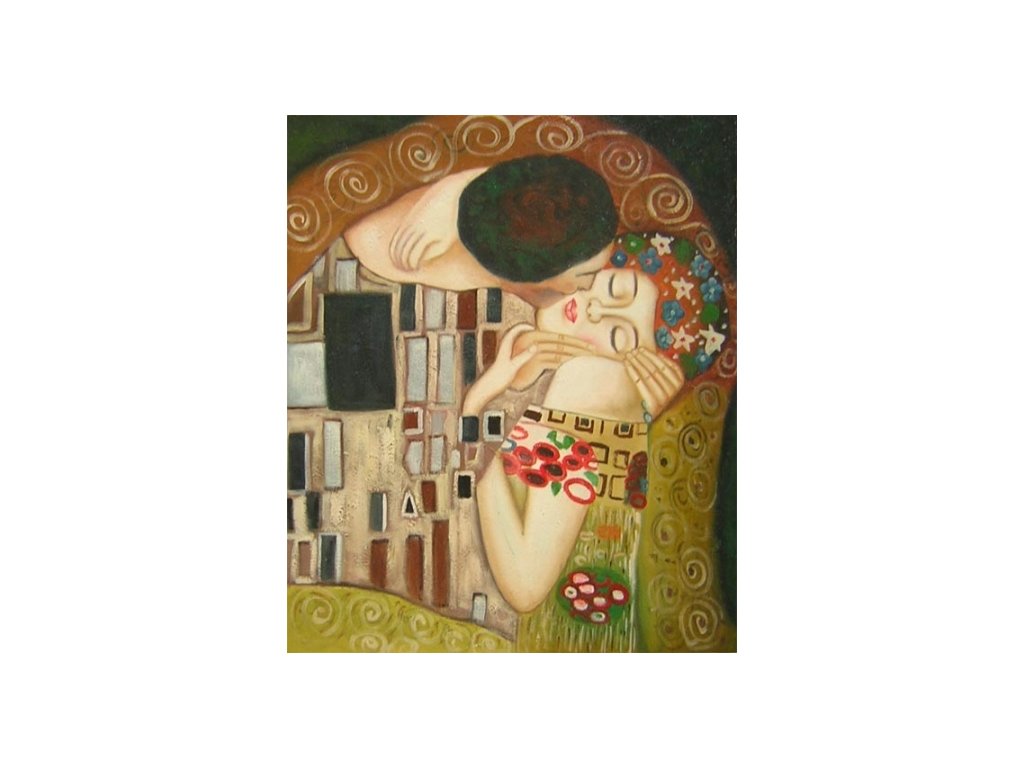 Obraz s motivem polibku muže a ženy. Obraz je malovaný olejovými barvami na kvalitní malířské plátno vyšší gramáže, napnuté na vypínací (skrytý) 2 cm široký blind rám. Ten je opatřený klínky pro případné dopnutí plátna. Díky probarveným okrajům lze obraz ihned zavěsit na zeď, nebo je možné také zarámování do ozdobného rámu. Nabídku naleznete v sekci rámy a rámování. Součástí je háček určený k zavěšení obrazu. Velikost 60 x 50 cm.