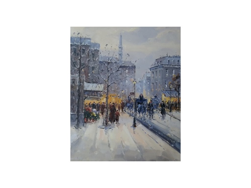 Na obrazu je zachycena poklidná a zároveň hektická atmosféra předvánočního města. Obraz je malovaný olejovými barvami na kvalitní malířské plátno vyšší gramáže, napnuté na vypínací (skrytý) 2 cm široký blind rám. Ten je opatřený klínky pro případné dopnutí plátna. Díky probarveným okrajům lze obraz ihned zavěsit na zeď, nebo je možné také zarámování do ozdobného rámu. Nabídku naleznete v sekci rámy a rámování. Součástí je háček určený k zavěšení obrazu.