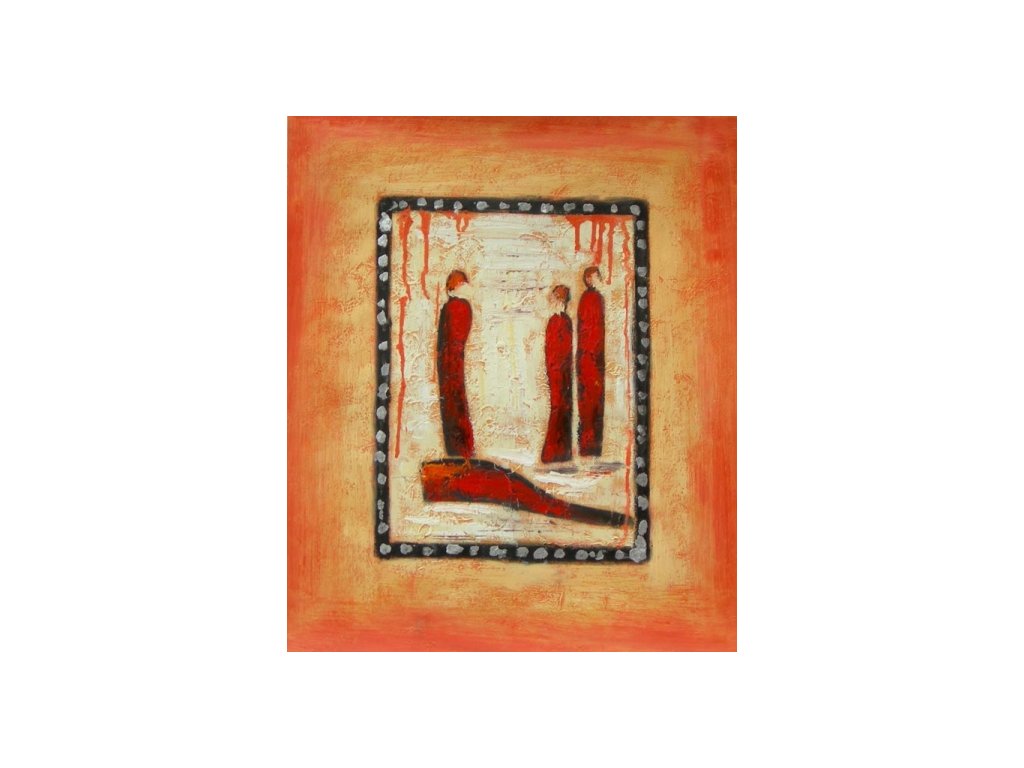 Na obraze jsou namalováni lidé v červených šatech stojící a přemýšlející. Obraz je malovaný olejovými barvami na kvalitní malířské plátno vyšší gramáže, napnuté na vypínací (skrytý) 2 cm široký blind rám. Ten je opatřený klínky pro případné dopnutí plátna. Díky probarveným okrajům lze obraz ihned zavěsit na zeď, nebo je možné také zarámování do ozdobného rámu. Nabídku naleznete v sekci rámy a rámování. Součástí je háček určený k zavěšení obrazu.Buďte prvý, kto napíše príspevok k tejto položke.
