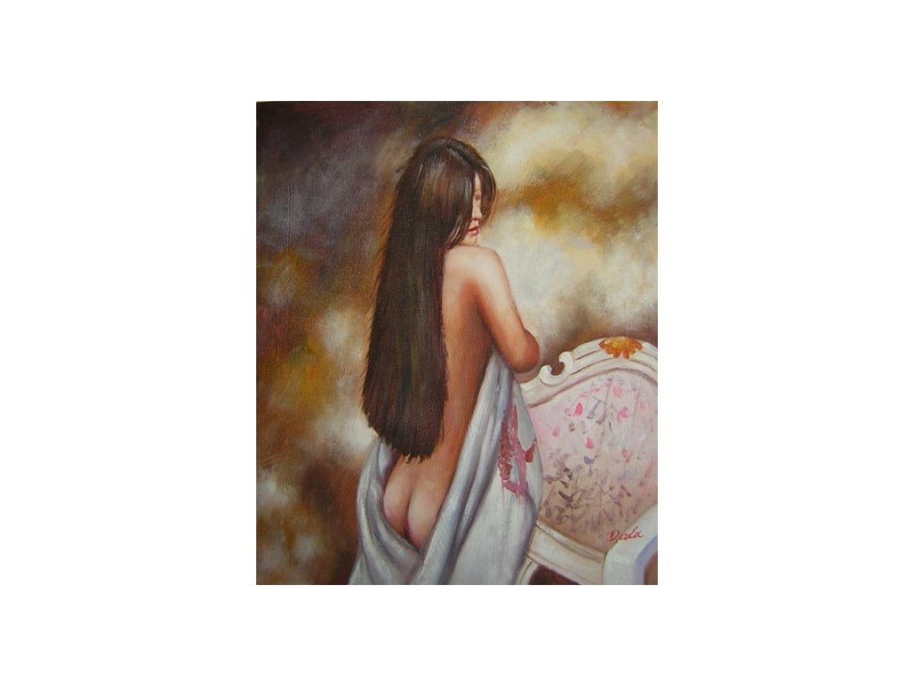 Na obraze je namalována žena zahalená do deky stojící před židlí. Obraz je malovaný olejovými barvami na kvalitní malířské plátno vyšší gramáže, napnuté na vypínací (skrytý) 2 cm široký blind rám. Ten je opatřený klínky pro případné dopnutí plátna. Díky probarveným okrajům lze obraz ihned zavěsit na zeď, nebo je možné také zarámování do ozdobného rámu. Nabídku naleznete v sekci rámy a rámování. Součástí je háček určený k zavěšení obrazu.