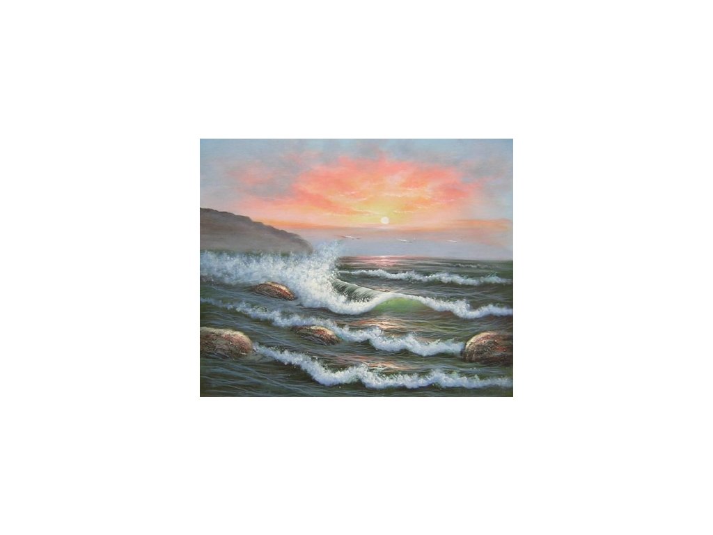 Obraz s motivem přílivu moře. Obraz je malovaný olejovými barvami na kvalitní malířské plátno vyšší gramáže, napnuté na vypínací (skrytý) 2 cm široký blind rám. Ten je opatřený klínky pro případné dopnutí plátna. Díky probarveným okrajům lze obraz ihned zavěsit na zeď, nebo je možné také zarámování do ozdobného rámu. Nabídku naleznete v sekci rámy a rámování. Součástí je háček určený k zavěšení obrazu.