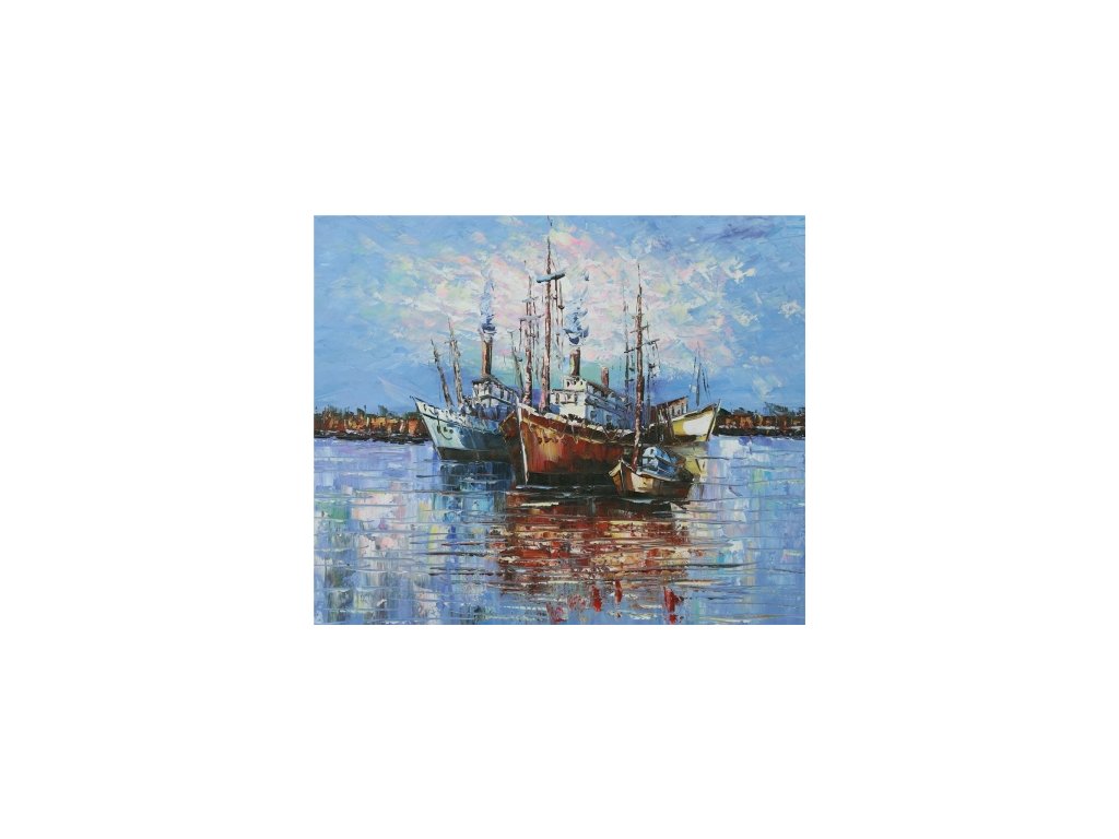 Obraz s motivem lodního přístavu. Obraz je malovaný olejovými barvami na kvalitní malířské plátno vyšší gramáže, napnuté na vypínací (skrytý) 2 cm široký blind rám. Ten je opatřený klínky pro případné dopnutí plátna. Díky probarveným okrajům lze obraz ihned zavěsit na zeď, nebo je možné také zarámování do ozdobného rámu. Nabídku naleznete v sekci rámy a rámování. Součástí je háček určený k zavěšení obrazu. Velikost obrazu 50 x 60 cm.