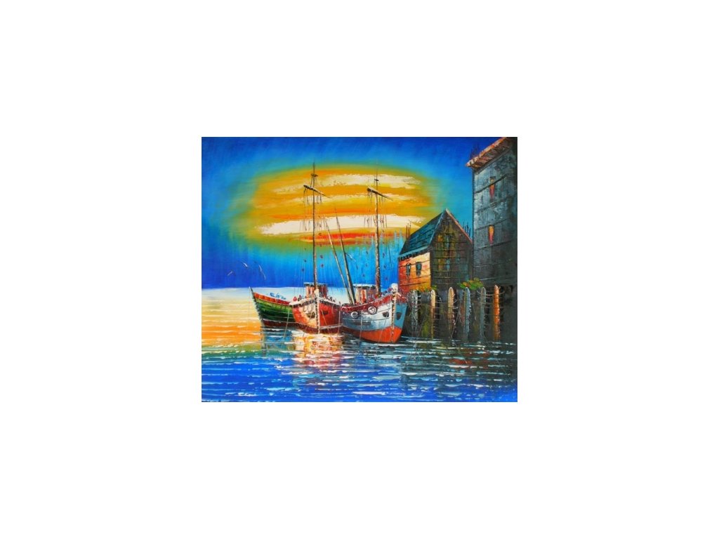Obraz s motivem přístavu lodí. Obraz je malovaný olejovými barvami na kvalitní malířské plátno vyšší gramáže, napnuté na vypínací (skrytý) 2 cm široký blind rám. Ten je opatřený klínky pro případné dopnutí plátna. Díky probarveným okrajům lze obraz ihned zavěsit na zeď, nebo je možné také zarámování do ozdobného rámu. Nabídku naleznete v sekci rámy a rámování. Součástí je háček určený k zavěšení obrazu.Buďte prvý, kto napíše príspevok k tejto položke.