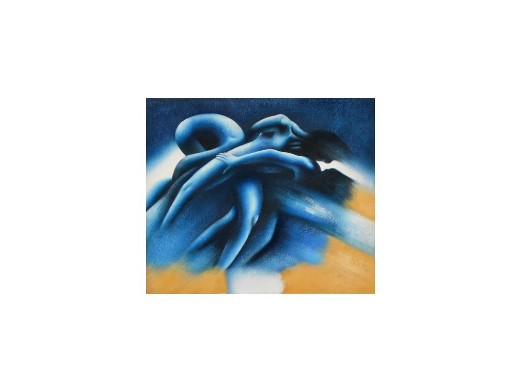 Motivem tohoto obrazu jsou postavy propletené do sebe v modrých barvách. Obraz je malovaný olejovými barvami na kvalitní malířské plátno vyšší gramáže, napnuté na vypínací (skrytý) 2 cm široký blind rám. Ten je opatřený klínky pro případné dopnutí plátna. Díky probarveným okrajům lze obraz ihned zavěsit na zeď, nebo je možné také zarámování do ozdobného rámu. Nabídku naleznete v sekci rámy a rámování. Součástí je háček určený k zavěšení obrazu.