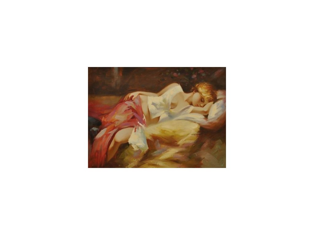 Obraz s motivem nádherné spící dívky. Obraz je malovaný olejovými barvami na kvalitní malířské plátno vyšší gramáže, napnuté na vypínací (skrytý) 2 cm široký blind rám. Ten je opatřený klínky pro případné dopnutí plátna. Díky probarveným okrajům lze obraz ihned zavěsit na zeď, nebo je možné také zarámování do ozdobného rámu. Nabídku naleznete v sekci rámy a rámování. Součástí je háček určený k zavěšení obrazu.Buďte prvý, kto napíše príspevok k tejto položke.