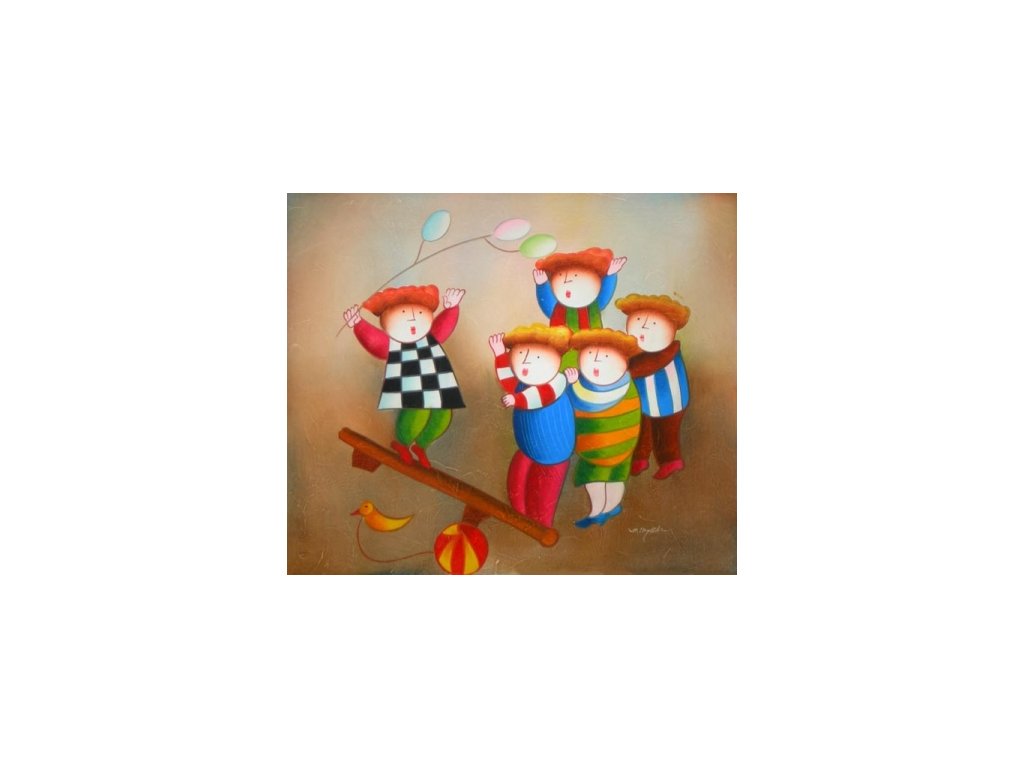 Motivem obrazu jsou děti na houpačce s balónky. Obraz je malovaný olejovými barvami na kvalitní malířské plátno vyšší gramáže, napnuté na vypínací (skrytý) 2 cm široký blind rám. Ten je opatřený klínky pro případné dopnutí plátna. Díky probarveným okrajům lze obraz ihned zavěsit na zeď, nebo je možné také zarámování do ozdobného rámu. Nabídku naleznete v sekci rámy a rámování. Součástí je háček určený k zavěšení obrazu.Buďte prvý, kto napíše príspevok k tejto položke.