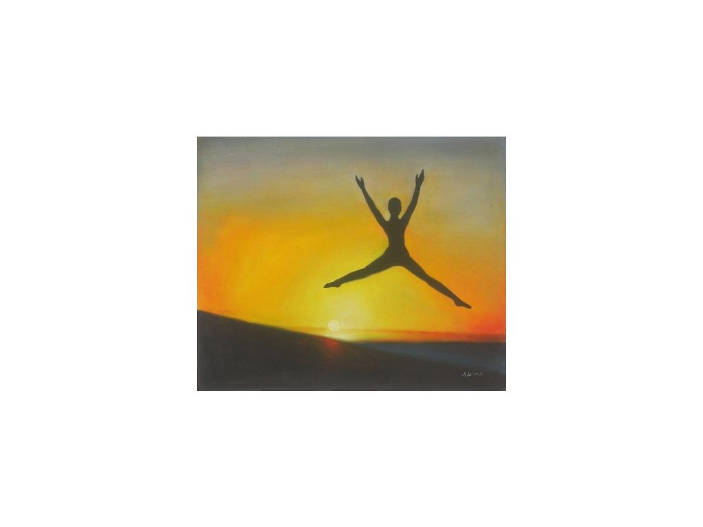 Na obraze je namalována postava při radostném výskoku při západu slunce. Obraz je malovaný olejovými barvami na kvalitní malířské plátno vyšší gramáže, napnuté na vypínací (skrytý) 2 cm široký blind rám. Ten je opatřený klínky pro případné dopnutí plátna. Díky probarveným okrajům lze obraz ihned zavěsit na zeď, nebo je možné také zarámování do ozdobného rámu. Nabídku naleznete v sekci rámy a rámování. Součástí je háček určený k zavěšení obrazu.