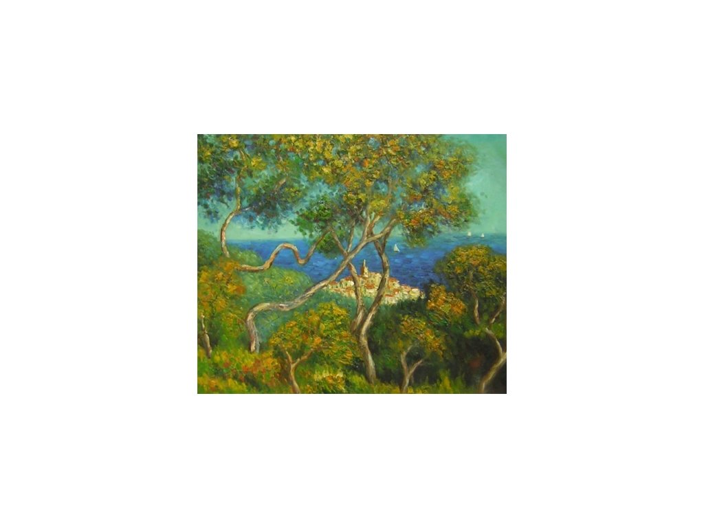 Obraz s motivem zvláštně rostlých stromů na přímořském pobřeží, známá reprodukce od Moneta. Obraz je malovaný olejovými barvami na kvalitní malířské plátno vyšší gramáže, napnuté na vypínací (skrytý) 2 cm široký blind rám. Ten je opatřený klínky pro případné dopnutí plátna. Díky probarveným okrajům lze obraz ihned zavěsit na zeď, nebo je možné také zarámování do ozdobného rámu. Nabídku naleznete v sekci rámy a rámování. Součástí je háček určený k zavěšení obrazu.