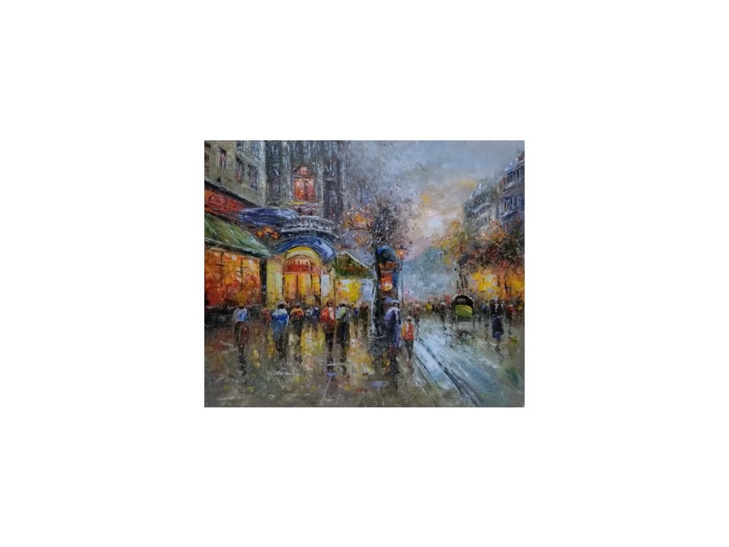 Obraz zachycuje živou atmosféru ulice města. Obraz je malovaný olejovými barvami na kvalitní malířské plátno vyšší gramáže, napnuté na vypínací (skrytý) 2 cm široký blind rám. Ten je opatřený klínky pro případné dopnutí plátna. Díky probarveným okrajům lze obraz ihned zavěsit na zeď, nebo je možné také zarámování do ozdobného rámu. Nabídku naleznete v sekci rámy a rámování. Součástí je háček určený k zavěšení obrazu.