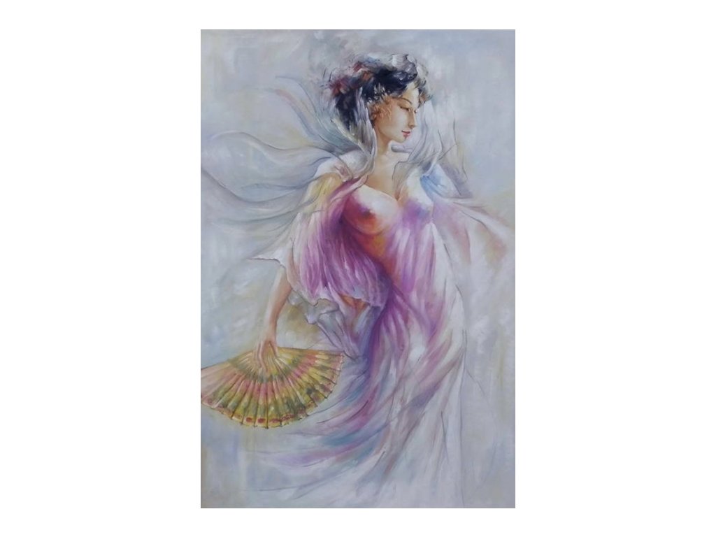 Motivem je žena, která ze zasněným výrazem tančí s vějířem v ruce. Obraz je malovaný olejovými barvami na kvalitní malířské plátno vyšší gramáže, napnuté na vypínací (skrytý) 2 cm široký blind rám. Ten je opatřený klínky pro případné dopnutí plátna. Díky probarveným okrajům lze obraz ihned zavěsit na zeď, nebo je možné také zarámování do ozdobného rámu. Nabídku naleznete v sekci rámy a rámování. Součástí je háček určený k zavěšení obrazu.