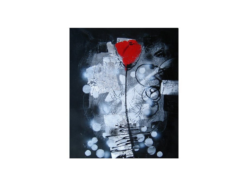 Na obraze je namalována červená růže na černobílém moderním pozadí. Obraz je malovaný olejovými barvami na kvalitní malířské plátno vyšší gramáže, napnuté na vypínací (skrytý) 2 cm široký blind rám. Ten je opatřený klínky pro případné dopnutí plátna. Díky probarveným okrajům lze obraz ihned zavěsit na zeď, nebo je možné také zarámování do ozdobného rámu. Nabídku naleznete v sekci rámy a rámování. Součástí je háček určený k zavěšení obrazu.