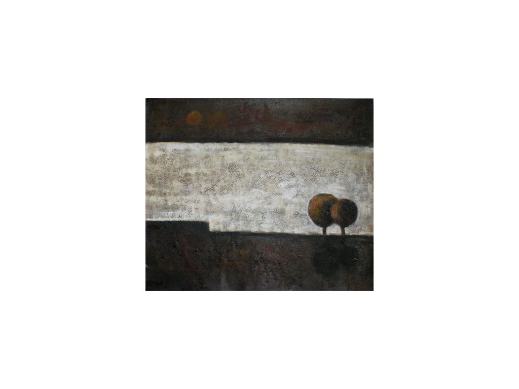Na obraze je namalovány dva tmavé stromy. Obraz je malovaný olejovými barvami na kvalitní malířské plátno vyšší gramáže, napnuté na vypínací (skrytý) 2 cm široký blind rám. Ten je opatřený klínky pro případné dopnutí plátna. Díky probarveným okrajům lze obraz ihned zavěsit na zeď, nebo je možné také zarámování do ozdobného rámu. Nabídku naleznete v sekci rámy a rámování. Součástí je háček určený k zavěšení obrazu.