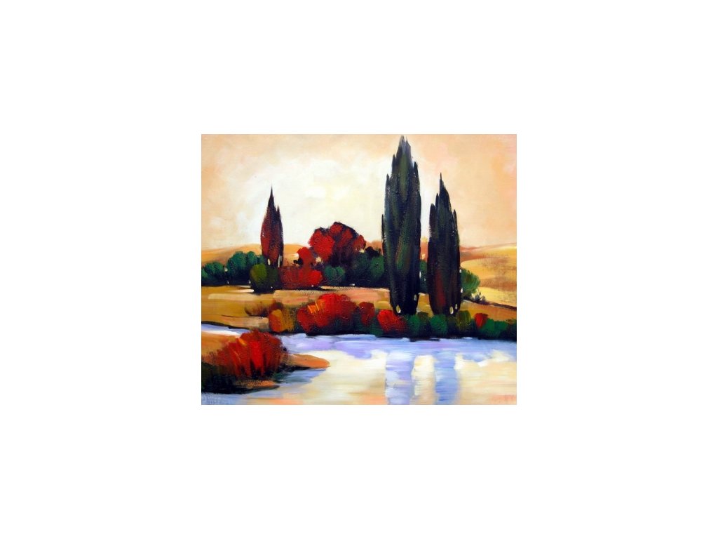 Na obraze jsou namalovány topoly tyčící se u jezera. Obraz je malovaný olejovými barvami na kvalitní malířské plátno vyšší gramáže, napnuté na vypínací (skrytý) 2 cm široký blind rám. Ten je opatřený klínky pro případné dopnutí plátna. Díky probarveným okrajům lze obraz ihned zavěsit na zeď, nebo je možné také zarámování do ozdobného rámu. Nabídku naleznete v sekci rámy a rámování. Součástí je háček určený k zavěšení obrazu.