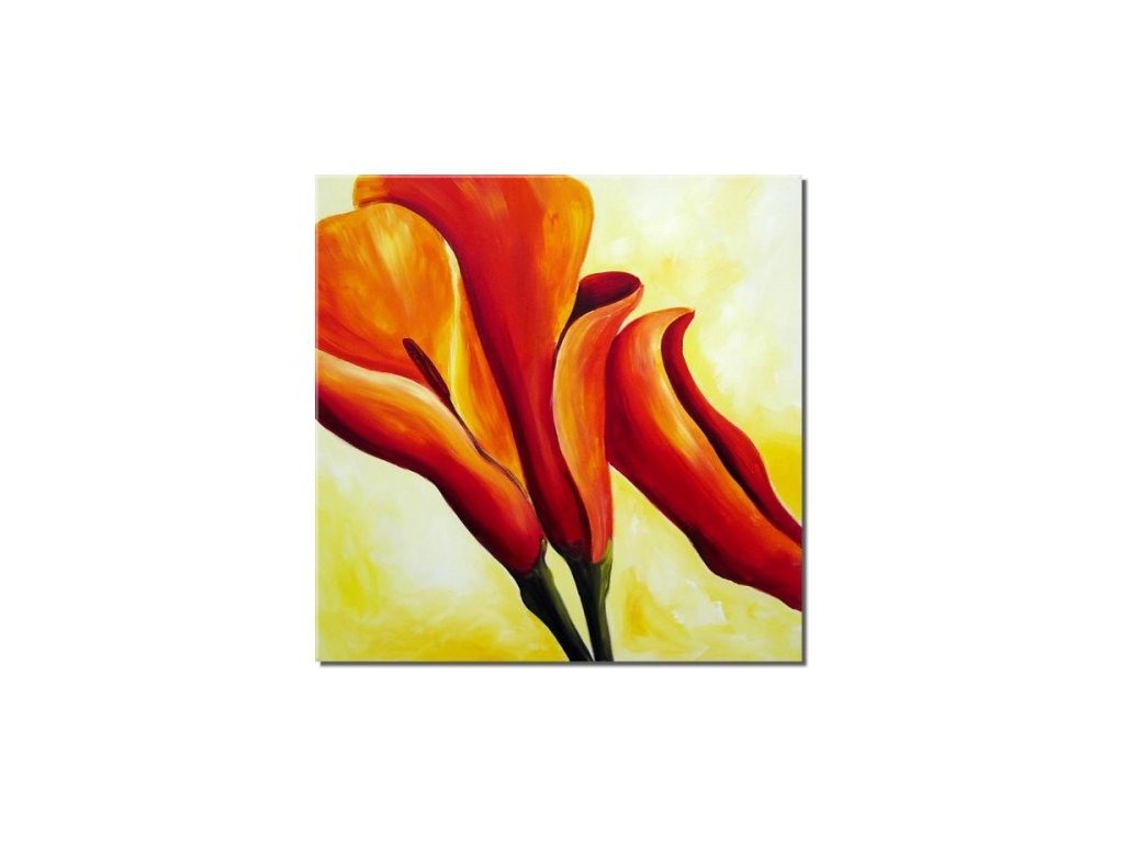 Na obraze jsou namalované tři červené květy kaly na žlutém pozadí. Obraz je malovaný olejovými barvami na kvalitní malířské plátno vyšší gramáže, napnuté na vypínací (skrytý) 2 cm široký blind rám. Ten je opatřený klínky pro případné dopnutí plátna. Díky probarveným okrajům lze obraz ihned zavěsit na zeď, nebo je možné také zarámování do ozdobného rámu. Nabídku naleznete v sekci rámy a rámování. Součástí je háček určený k zavěšení obrazu.