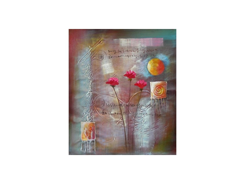 Moderním způsobem namalována kompozice tří květů na šedém pozadí. Obraz je malovaný olejovými barvami na kvalitní malířské plátno vyšší gramáže, napnuté na vypínací (skrytý) 2 cm široký blind rám. Ten je opatřený klínky pro případné dopnutí plátna. Díky probarveným okrajům lze obraz ihned zavěsit na zeď, nebo je možné také zarámování do ozdobného rámu. Nabídku naleznete v sekci rámy a rámování. Součástí je háček určený k zavěšení obrazu.