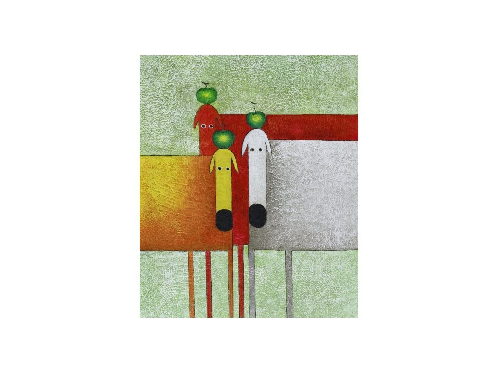 Motivem jsou tři psi se zelenými jablky. Obraz je malovaný olejovými barvami na kvalitní malířské plátno vyšší gramáže, napnuté na vypínací (skrytý) 2 cm široký blind rám. Ten je opatřený klínky pro případné dopnutí plátna. Díky probarveným okrajům lze obraz ihned zavěsit na zeď, nebo je možné také zarámování do ozdobného rámu. Nabídku naleznete v sekci rámy a rámování. Součástí je háček určený k zavěšení obrazu. Velikost obrazu je 60 x 50 cm.
