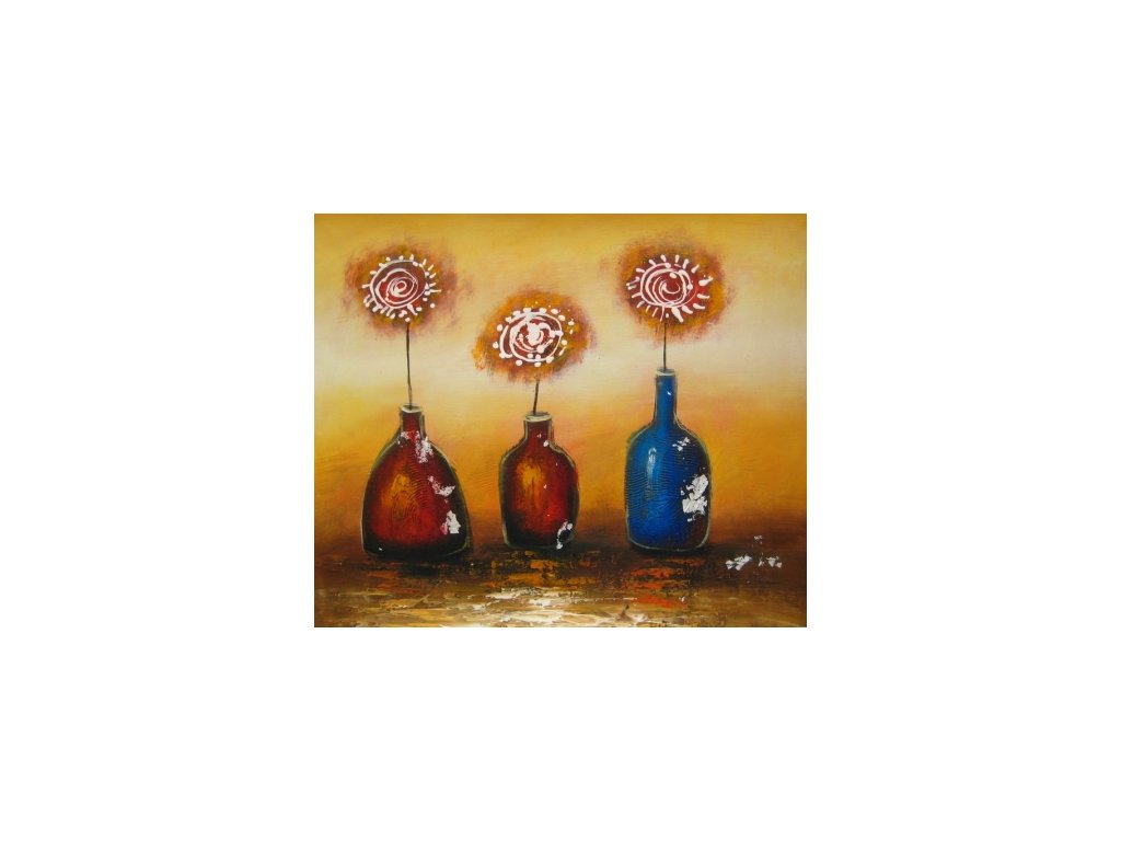 Na obraze jsou namalovány tři vázy s třemi květy. Obraz je malovaný olejovými barvami na kvalitní malířské plátno vyšší gramáže, napnuté na vypínací (skrytý) 2 cm široký blind rám. Ten je opatřený klínky pro případné dopnutí plátna. Díky probarveným okrajům lze obraz ihned zavěsit na zeď, nebo je možné také zarámování do ozdobného rámu. Nabídku naleznete v sekci rámy a rámování. Součástí je háček určený k zavěšení obrazu.Buďte prvý, kto napíše príspevok k tejto položke.