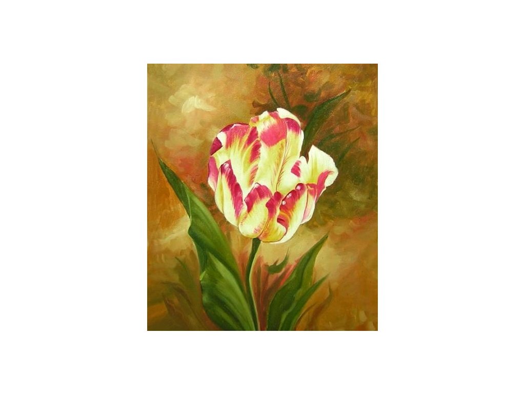 Motivem obrazu je žluto-růžový květ tulipánu. Obraz je malovaný olejovými barvami na kvalitní malířské plátno vyšší gramáže, napnuté na vypínací (skrytý) 2 cm široký blind rám. Ten je opatřený klínky pro případné dopnutí plátna. Díky probarveným okrajům lze obraz ihned zavěsit na zeď, nebo je možné také zarámování do ozdobného rámu. Nabídku naleznete v sekci rámy a rámování. Součástí je háček určený k zavěšení obrazu.