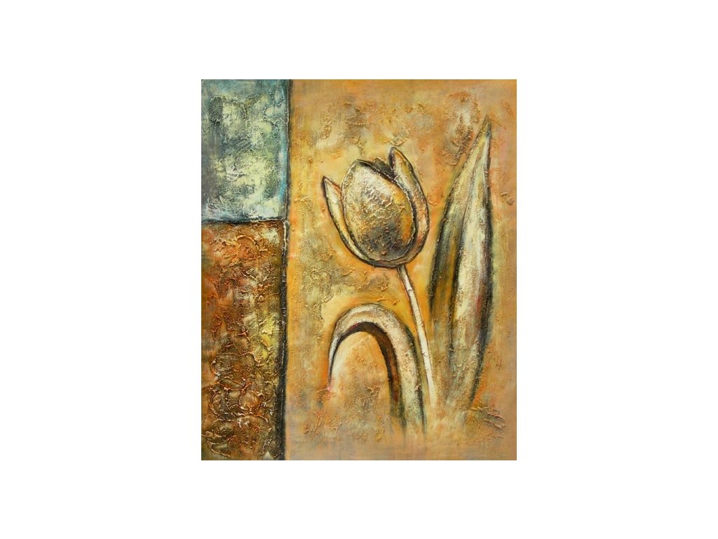 Hlavním motivem je květ tulipánu. Obraz je malovaný olejovými barvami na kvalitní malířské plátno vyšší gramáže, napnuté na vypínací (skrytý) 2 cm široký blind rám. Ten je opatřený klínky pro případné dopnutí plátna. Díky probarveným okrajům lze obraz ihned zavěsit na zeď, nebo je možné také zarámování do ozdobného rámu. Nabídku naleznete v sekci rámy a rámování. Součástí je háček určený k zavěšení obrazu.