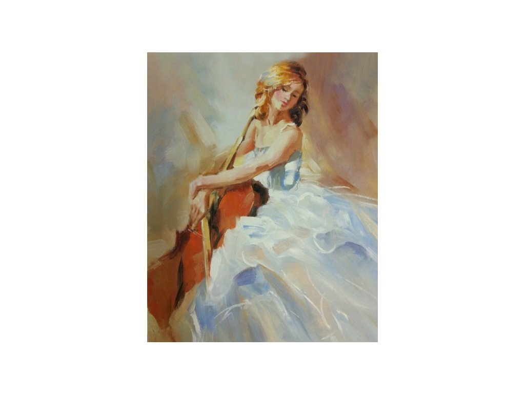 Na obraze je zachycena žena hrající na violoncello. Obraz je malovaný olejovými barvami na kvalitní malířské plátno vyšší gramáže, napnuté na vypínací (skrytý) 2 cm široký blind rám. Ten je opatřený klínky pro případné dopnutí plátna. Díky probarveným okrajům lze obraz ihned zavěsit na zeď, nebo je možné také zarámování do ozdobného rámu. Nabídku naleznete v sekci rámy a rámování. Součástí je háček určený k zavěšení obrazu.Buďte prvý, kto napíše príspevok k tejto položke.