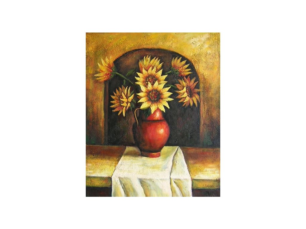 Motivem je červená váza s kyticí žlutých slunečnic. Obraz je malovaný olejovými barvami na kvalitní malířské plátno vyšší gramáže, napnuté na vypínací (skrytý) 2 cm široký blind rám. Ten je opatřený klínky pro případné dopnutí plátna. Díky probarveným okrajům lze obraz ihned zavěsit na zeď, nebo je možné také zarámování do ozdobného rámu. Nabídku naleznete v sekci rámy a rámování. Součástí je háček určený k zavěšení obrazu.Buďte prvý, kto napíše príspevok k tejto položke.