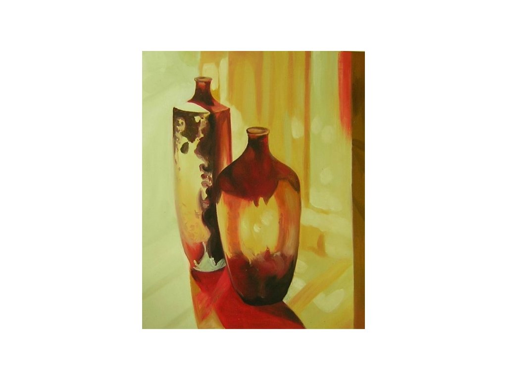 Na obraze jsou namalovány dvě vázy. Obraz je malovaný olejovými barvami na kvalitní malířské plátno vyšší gramáže, napnuté na vypínací (skrytý) 2 cm široký blind rám. Ten je opatřený klínky pro případné dopnutí plátna. Díky probarveným okrajům lze obraz ihned zavěsit na zeď, nebo je možné také zarámování do ozdobného rámu. Nabídku naleznete v sekci rámy a rámování. Součástí je háček určený k zavěšení obrazu.Buďte prvý, kto napíše príspevok k tejto položke.