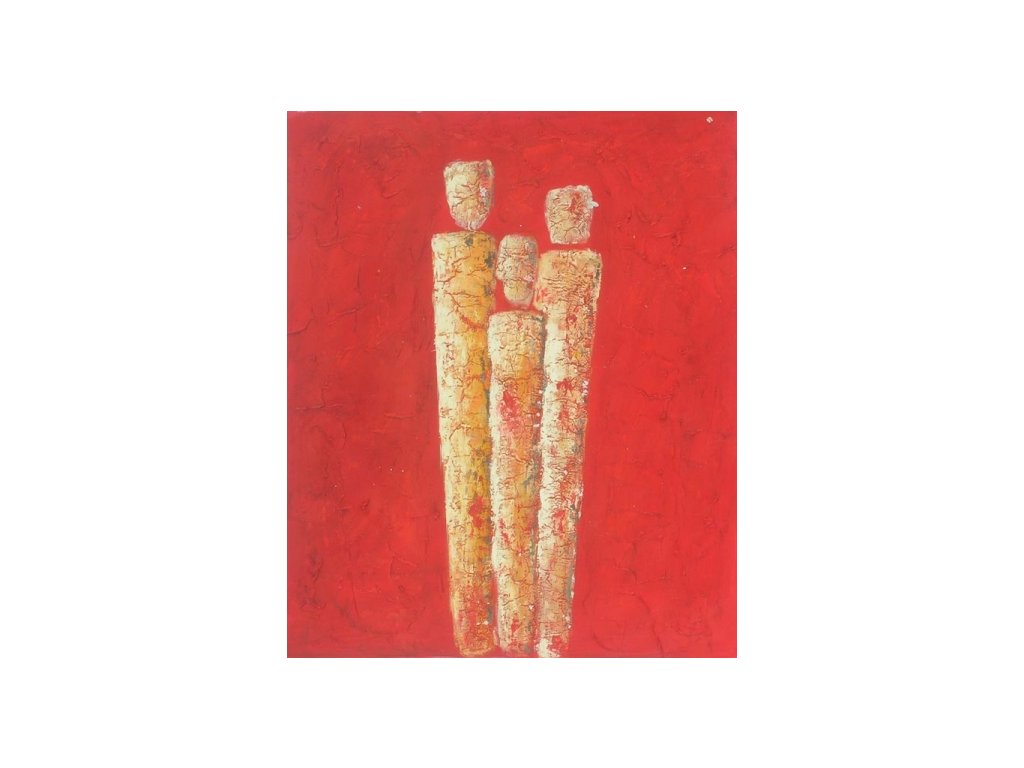 Na obraze je na červeném pozadí namalována kompozice tří soch lidských postav znázorňující rodinu. Obraz je malovaný olejovými barvami na kvalitní malířské plátno vyšší gramáže, napnuté na vypínací (skrytý) 2 cm široký blind rám. Ten je opatřený klínky pro případné dopnutí plátna. Díky probarveným okrajům lze obraz ihned zavěsit na zeď, nebo je možné také zarámování do ozdobného rámu. Nabídku naleznete v sekci rámy a rámování. Součástí je háček určený k zavěšení obrazu.