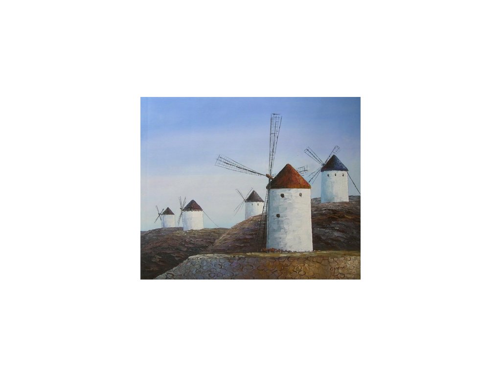 Obraz s motivem větrných mlýnů. Obraz je malovaný olejovými barvami na kvalitní malířské plátno vyšší gramáže, napnuté na vypínací (skrytý) 2 cm široký blind rám. Ten je opatřený klínky pro případné dopnutí plátna. Díky probarveným okrajům lze obraz ihned zavěsit na zeď, nebo je možné také zarámování do ozdobného rámu. Nabídku naleznete v sekci rámy a rámování. Součástí je háček určený k zavěšení obrazu.