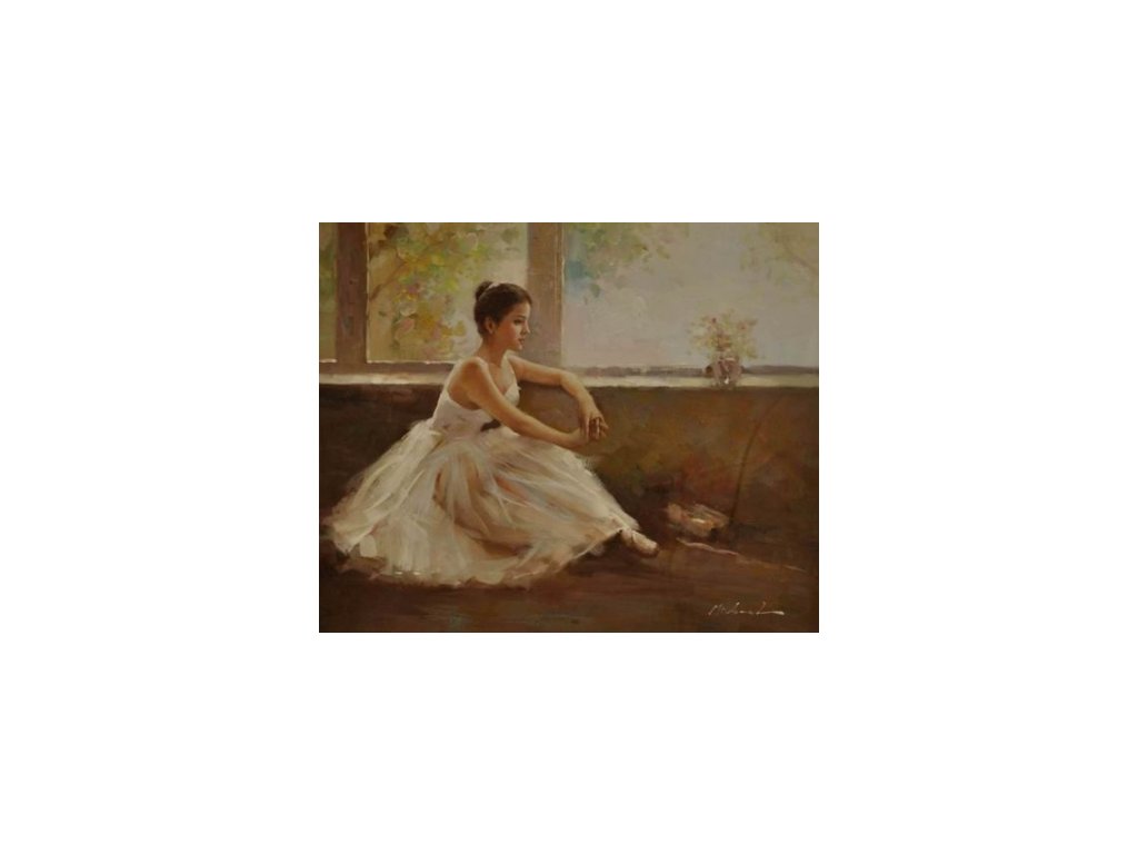 Obraz s motivem nádherné baletky sedící u okna. Obraz je malovaný olejovými barvami na kvalitní malířské plátno vyšší gramáže, napnuté na vypínací (skrytý) 2 cm široký blind rám. Ten je opatřený klínky pro případné dopnutí plátna. Díky probarveným okrajům lze obraz ihned zavěsit na zeď, nebo je možné také zarámování do ozdobného rámu. Nabídku naleznete v sekci rámy a rámování. Součástí je háček určený k zavěšení obrazu.