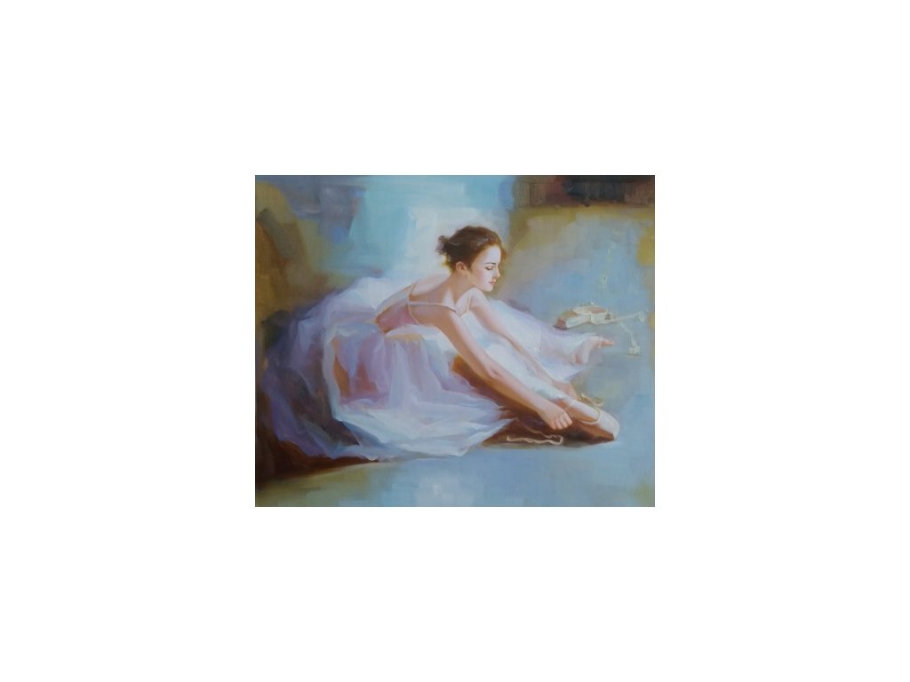 Hlavním motivem je baletka připravující se na tanec. Obraz je malovaný olejovými barvami na kvalitní malířské plátno vyšší gramáže, napnuté na vypínací (skrytý) 2 cm široký blind rám. Ten je opatřený klínky pro případné dopnutí plátna. Díky probarveným okrajům lze obraz ihned zavěsit na zeď, nebo je možné také zarámování do ozdobného rámu. Nabídku naleznete v sekci rámy a rámování. Součástí je háček určený k zavěšení obrazu.Buďte prvý, kto napíše príspevok k tejto položke.