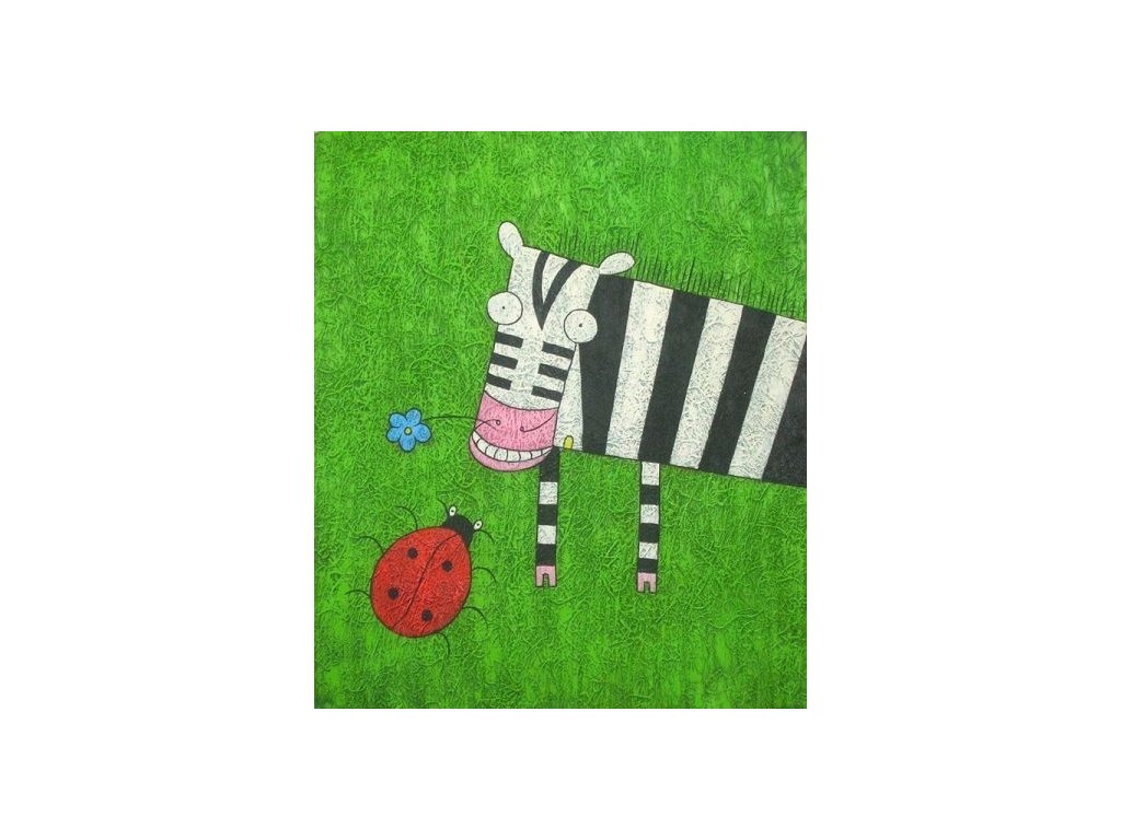 Motivem obrazu je veselá usmívající se zebry a malá červená beruška na zelené louce. Obraz je malovaný olejovými barvami na kvalitní malířské plátno vyšší gramáže, napnuté na vypínací (skrytý) 2 cm široký blind rám. Ten je opatřený klínky pro případné dopnutí plátna. Díky probarveným okrajům lze obraz ihned zavěsit na zeď, nebo je možné také zarámování do ozdobného rámu. Nabídku naleznete v sekci rámy a rámování. Součástí je háček určený k zavěšení obrazu.