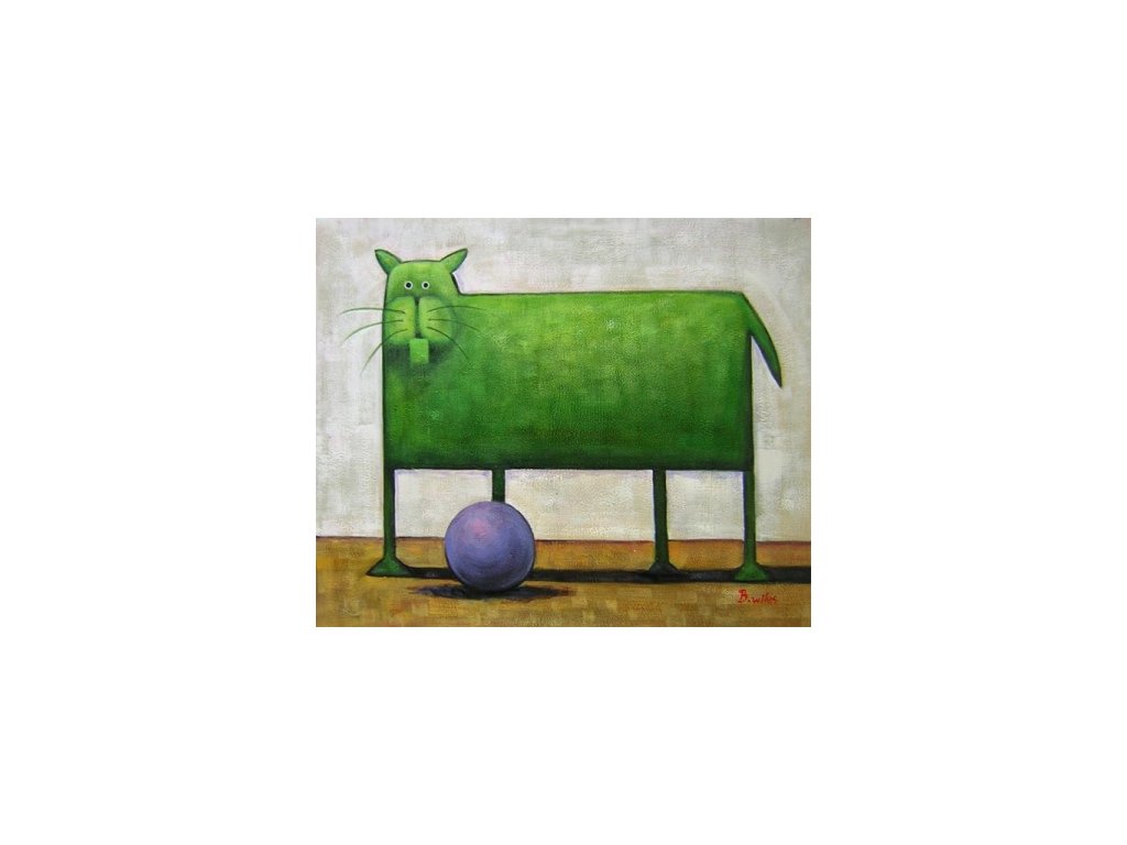 Na obraze je namalovaná zelená kočka s fialovým míčem. Obraz je malovaný olejovými barvami na kvalitní malířské plátno vyšší gramáže, napnuté na vypínací (skrytý) 2 cm široký blind rám. Ten je opatřený klínky pro případné dopnutí plátna. Díky probarveným okrajům lze obraz ihned zavěsit na zeď, nebo je možné také zarámování do ozdobného rámu. Nabídku naleznete v sekci rámy a rámování. Součástí je háček určený k zavěšení obrazu.