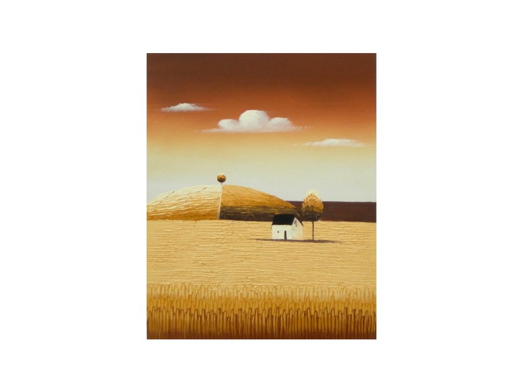 Na obraze je namalovaná krajina s obilným polem, kde uprostřed stojí domek. Obraz je malovaný olejovými barvami na kvalitní malířské plátno vyšší gramáže, napnuté na vypínací (skrytý) 2 cm široký blind rám. Ten je opatřený klínky pro případné dopnutí plátna. Díky probarveným okrajům lze obraz ihned zavěsit na zeď, nebo je možné také zarámování do ozdobného rámu. Nabídku naleznete v sekci rámy a rámování. Součástí je háček určený k zavěšení obrazu.