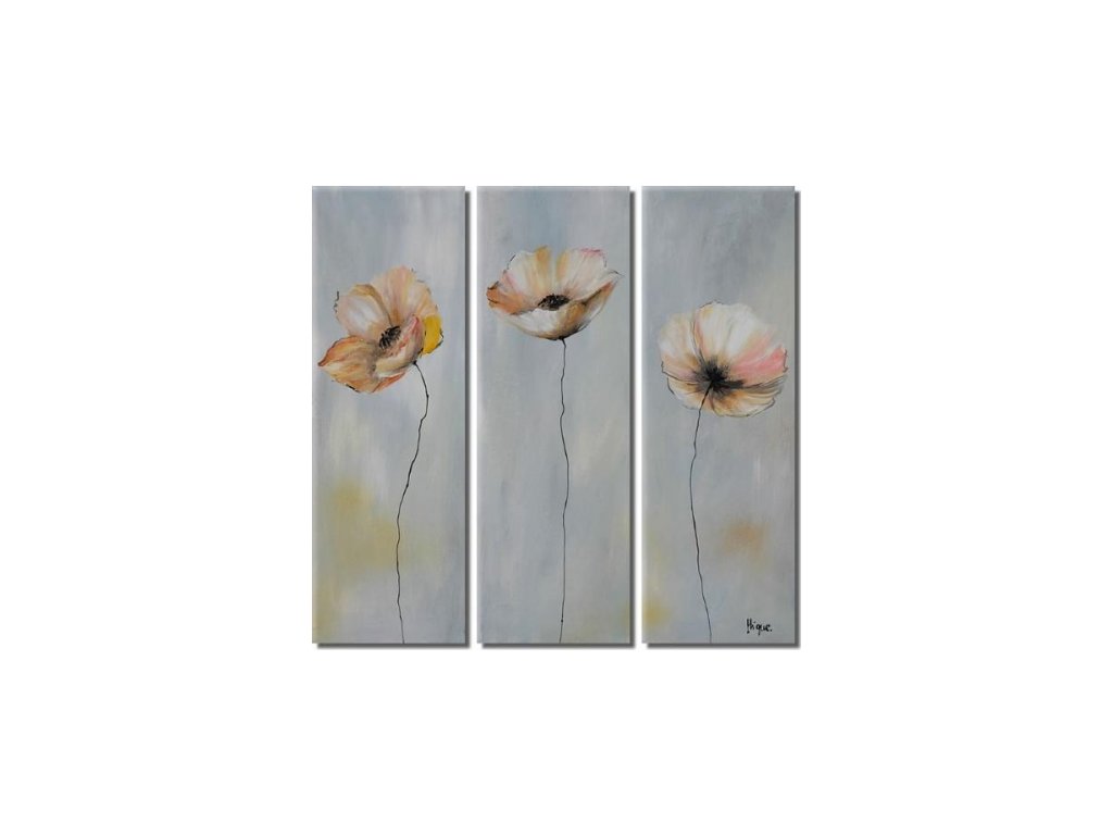 3 x 120 cm x 40 cm Ručně malovaný obrazový set s motivem květů na světlém pozadí. Obrazový vícedílný set je složen ze tří samostatných obrazů, které se vzájemně doplňují. Krásný motiv je ideální řešení do moderního bytu. Obraz je malován olejovými barvami na plátno, vypnuté na dřevěný blind rám s vypínacími klínky, které umožní případnou korekci plátna.