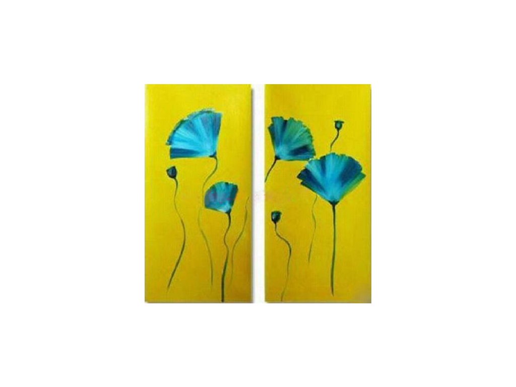 2x 40x80cm Dvoudílný ručně malovaný obrazový set. Motiv modrých květin na výrazném žlutém pozadí. Obrazový set je malován olejovými barvami na plátno, vypnuté na dřevěný blind rám s vypínacími klínky.