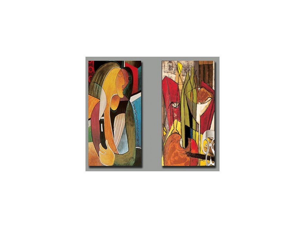 2x 40x80cm Dvoudílný ručně malovaný obrazový set. Na levém panelu jsou abstraktně pojaty dvě objímající se postavy. Zajímavá kombinace dvou vícebarevných panelů, každý v odlišném barevném ladění.