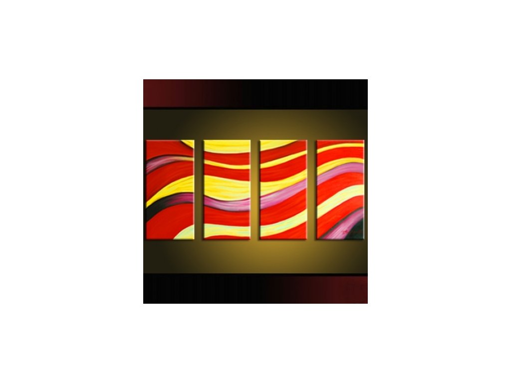 4x 70x30cm Čtyřdílný ručně malovaný obrazový set. Spojení teplých barev dodávajích energii v ladných vlnách. Obrazový set se skládá ze čtyř dílů, které na sebe vzájemně navazují. Každý díl setu je vypnut na dřevěném vypínacím blind rámu.