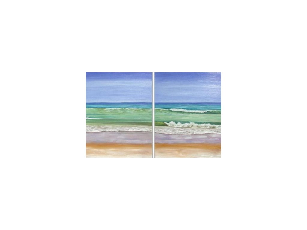 2 x 60 x 50 cm Dvoudílný ručně malovaný obrazový set. Uklidňující motiv mořských vln na písečném pobřeží. Krásná kombinace tyrkysové a modré. Obrazový set je malován olejovými barvami na plátno, vypnuté na dřevěný blind rám s vypínacími klínky.
