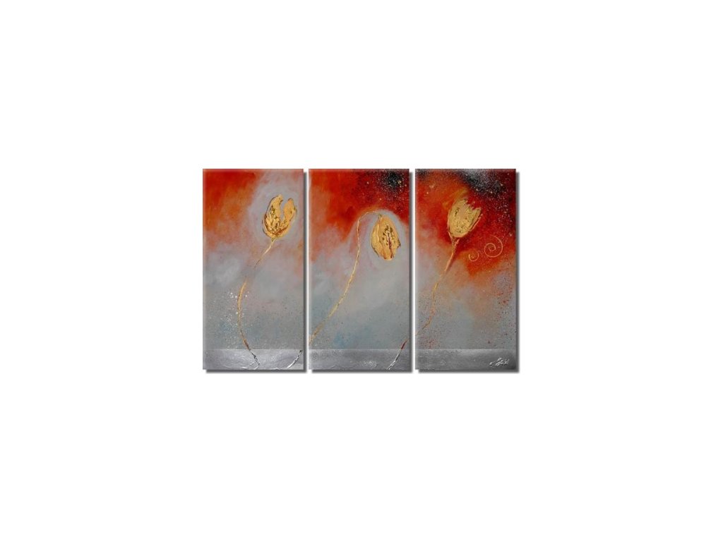 3x 100 cm x 50 cm Třídílný ručně malovaný obrazový set s motivem zlatých květů. Obrazový set je malován olejovými barvami na plátno, které je vypnuté na dřevěný blind rám s vypínacími klínky. Ty umožňují případnou korekci napnutí plátna.