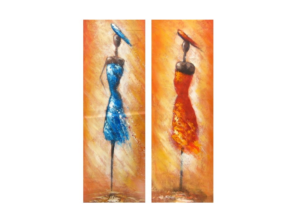 2 ks x 120 cm x 40 cm Ručně malovaný obrazový set skládající se ze dvou obrazů namalovaný olejovými barvami, vypnutý v dřevěném rámu s motivem dvou žen, červené a modré.