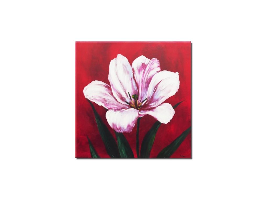 Na obraze je namalovaný růžovo-bílý květ na červeném pozadí. Obraz je malovaný olejovými barvami na kvalitní malířské plátno vyšší gramáže, napnuté na vypínací (skrytý) 2 cm široký blind rám. Ten je opatřený klínky pro případné dopnutí plátna. Díky probarveným okrajům lze obraz ihned zavěsit na zeď, nebo je možné také zarámování do ozdobného rámu. Nabídku naleznete v sekci rámy a rámování. Součástí je háček určený k zavěšení obrazu.