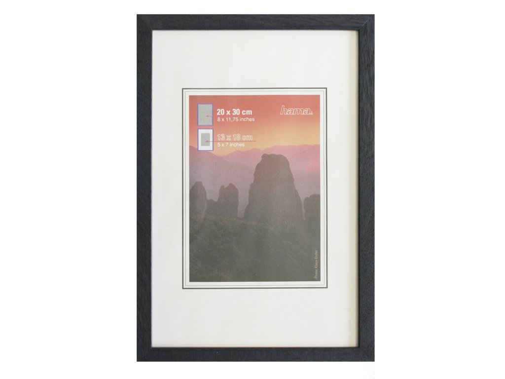 Dřevěný rám na fotografie, obrázky nebo diplomy. Rám má čiré sklo se zabroušenými hranami, zadní opěrná deska je vyrobena z dřevovláknité desky, která je upevněna flexi-pointy, dřevěná lišta široká 1,2 cm a vysoká 3 cm je mořená do černé barvy. Způsob zavěšení rámečku je pomocí násunutého háčku.