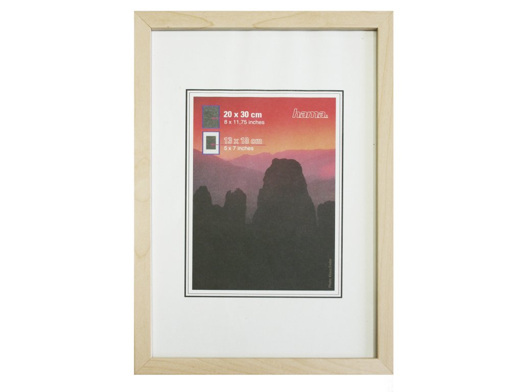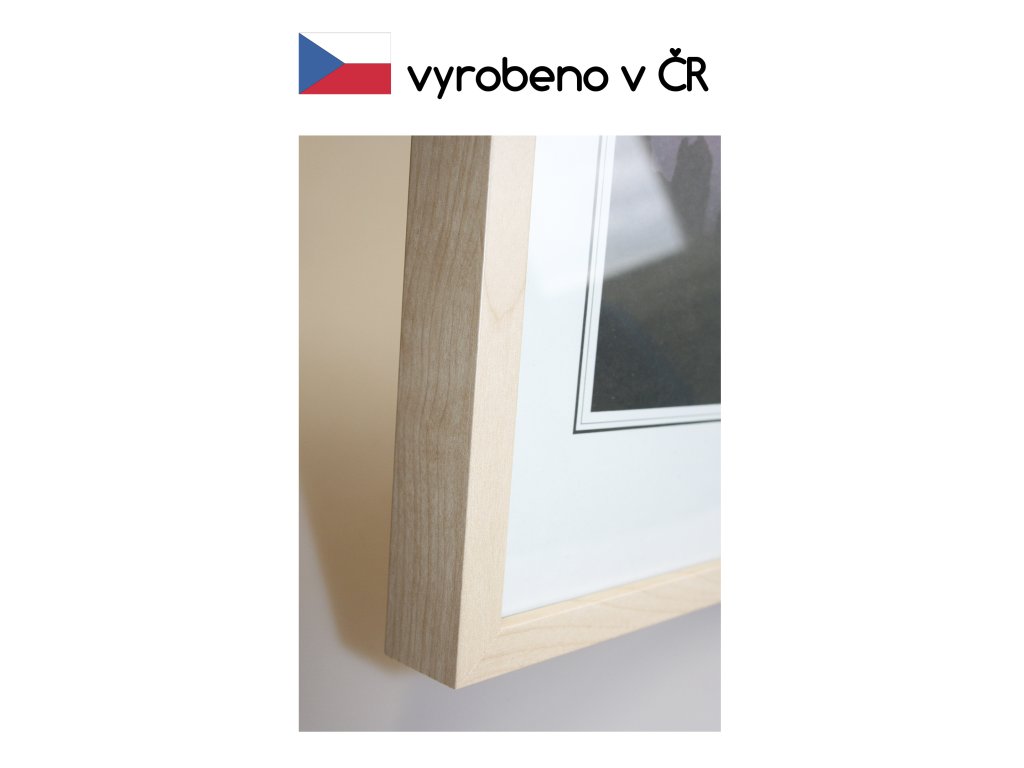 Dřevěný rám na fotografie, obrázky nebo diplomy. Rám má čiré sklo se zabroušenými hranami, zadní opěrná deska je vyrobena z dřevovláknité desky, která je upevněna flexi-pointy, dřevěná lišta široká 1,2 cm a vysoká 3 cm je mořená do přírodní barvy. Způsob zavěšení rámečku je pomocí násunutého háčku.