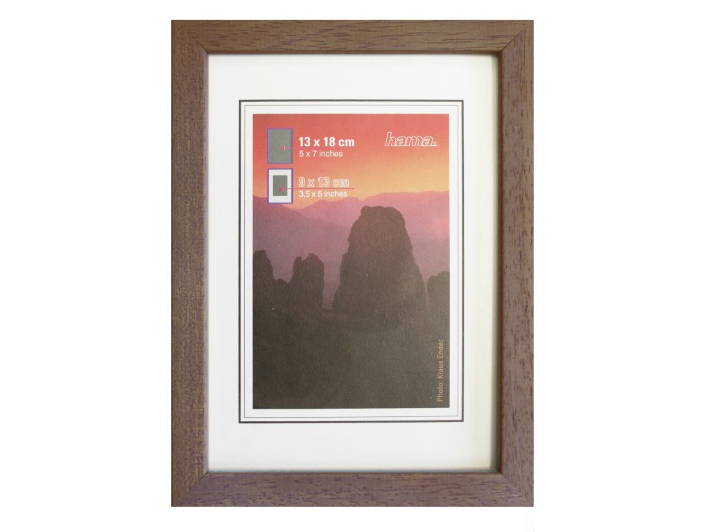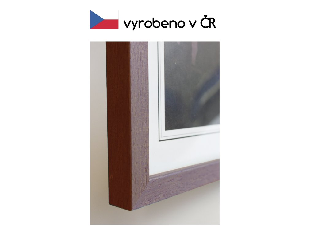 Rámeček  na fotografie, dětské obrázky nebo diplomy. Rám je osazen sklem a tvrzenou zadní deskou  která je upevněna flexi - pointy. Lišta je vyrobená ze dřeva,  potažena barevnou fólií,  šiřka 1,5 cm a výška 1,5 cm v tmavě hnědé barvě. Rámeček lze zavěsit jak na výšku tak šířku nebo postavit  na stůl (výklopná opěrka)