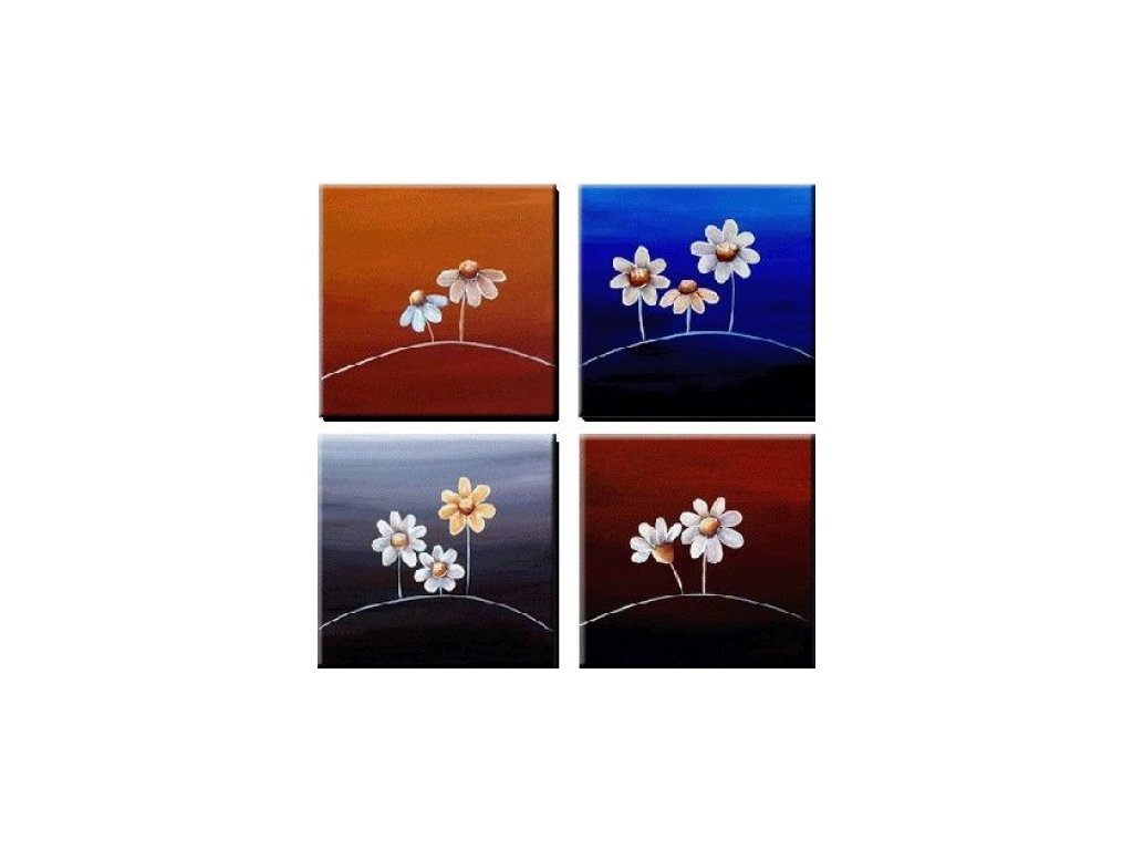 4x 50x50 cm Čtyřdílný ručně malovaný obrazový set. Krásný jednoduchý motiv květinek na prolínajícím se pozadí v oranžových a modrých tónech. Obrazový set je malován olejovými barvami na plátno, vypnuté na dřevěný blind rám s vypínacími klínky.