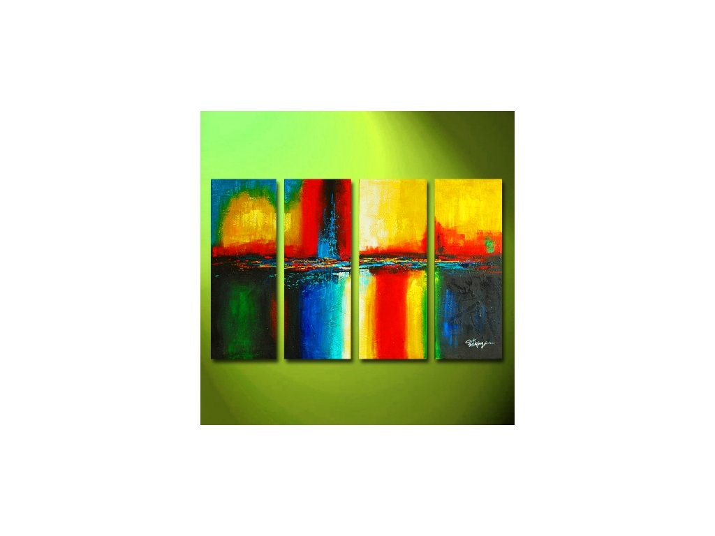 4 x 35 x 90 cm Ručně malovaný obrazový set olejovými barvami na plátně. Obrazový set je vypnut na dřevěném vypínacím blind rámu. Na tomto obrazovém setu je namalována moderní barevná abstrakce s názvem moře. Obrazový set se skládá ze čtyř samostatných obrazů které na sebe navazují.