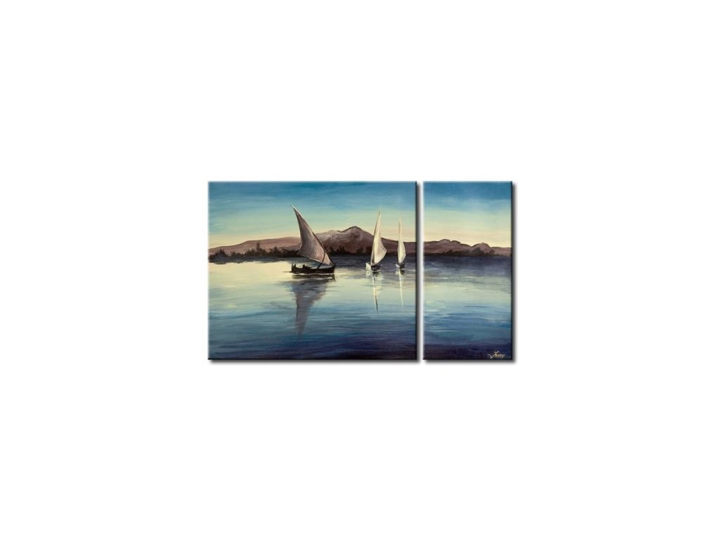 , 30 x 60 cm Dvoudílný ručně malovaný obrazový set v jemných modrých tónech s motivem člunů. Malba na plátno, které je vypnuto na dřevěný blind rám. Malba přesahuje hrany obrazů, čímž nenarušuje boční pohled. Obrazový set je malován olejovými barvami na plátno, vypnuté na dřevěný blind rám s vypínacími klínky.