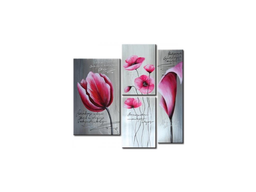 90x60, 2x 60x40, 110x30 cm Čtyřdílný ručně malovaný obrazový set, vypnutý na dřevěném blind rámu s vypínacími klínky. Obrazový set je malován olejovými barvami na plátně s motivem růžových květů.