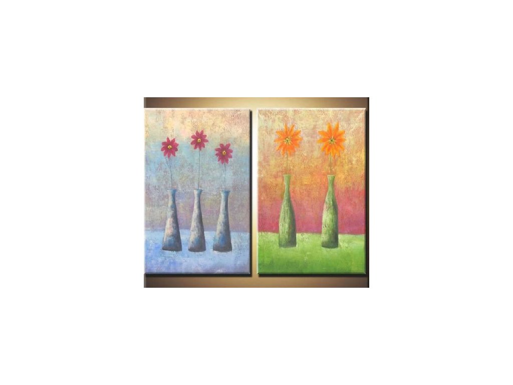 2 x 70 x 40 cm Dvoudílný ručně malovaný obraz. Každý panel v jiné barvě, spojené motivem květin ve vázách. Obrazový set je malován olejovými barvami na plátno, vypnuté na dřevěný blind rám s vypínacími klínky.Buďte prvý, kto napíše príspevok k tejto položke.