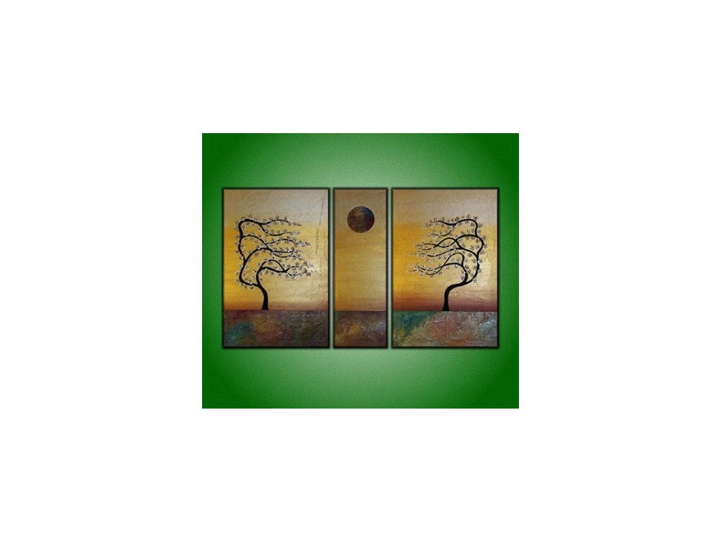 2 x 40 x 60, 20 x 60cm Třídílný ručně malovaný obrazový set s motivem stromů natahujícím se ke slunci. Jemné barevné ladění. Obrazový set je malován olejovými barvami na plátno, vypnuté na dřevěný blind rám s vypínacími klínky.